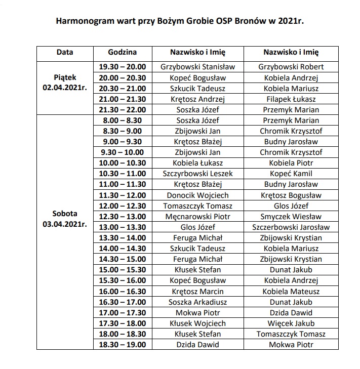 Dnia 30.03.2015 ustala się na godzinie 1800 zebranie w salce szkoleniowej dotyczące ustalenie harmonogramu warty przy Bożym Grobie.